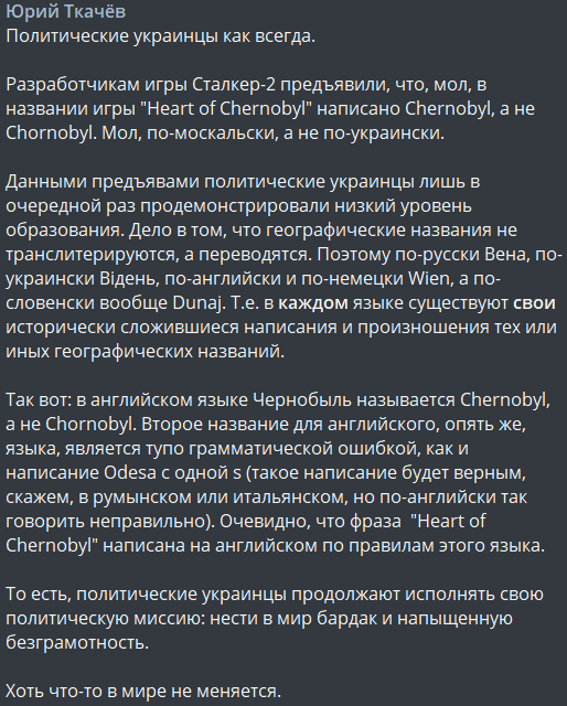 "Разработчикам игры Сталкер-2 предъявили, что, мол, в названии игры "Heart of Chernobyl" написано Chernobyl, а не Chornobyl. Мол, по-москальски, а не по-украински.