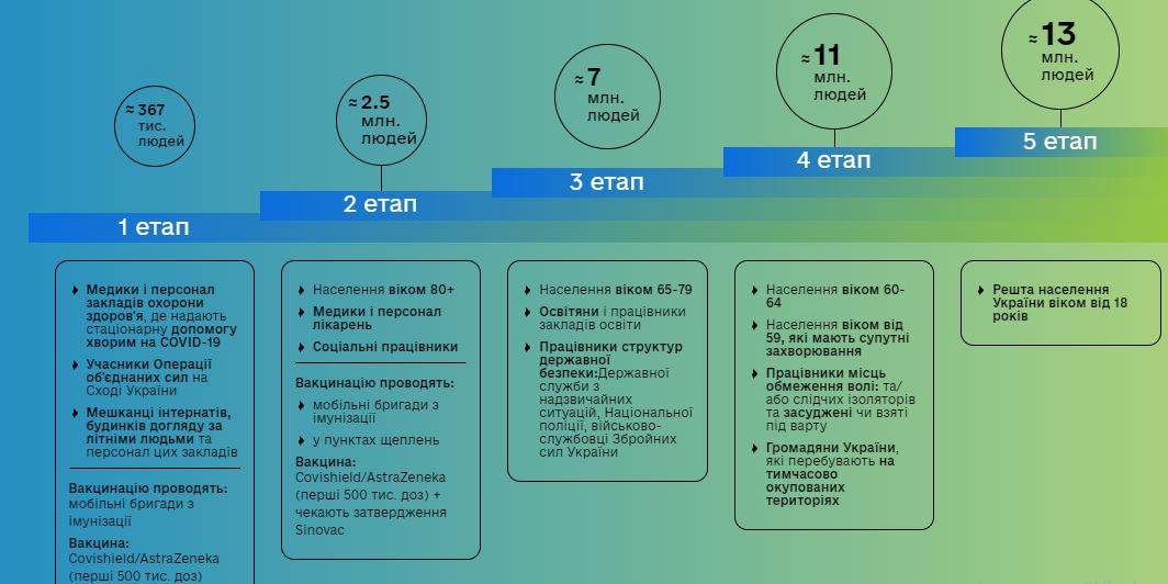 Первый этап. В первую очередь вакцинировали медиков, которые работали с ковид-больными, военнослужащих в зоне ООС на Донбассе, пожилых людей из домов престарелых и интернатов и работников этих учреждений. Прививали "Ковишилдом". Других вакцин на тот момент не было. Также привиться без очереди могли публичные лица - для популяризации прививок от коронавируса.