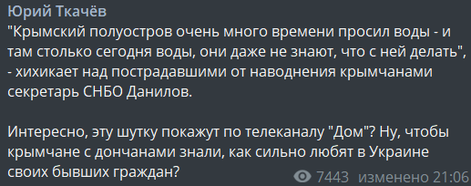 "Крымский полуостров очень много времени просил воды – и там столько сегодня воды, они даже не знают, что с ней делать. И вчера в украинской Керчи, и сегодня в украинской Ялте, к сожалению, произошла такая ситуация. Господь Бог слишком много им дал воды сразу", – сказал секретарь СНБО.