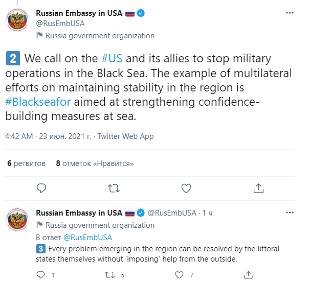 Дипломаты указали, что масштаб и "явно агрессивный характер" маневров Sea Breeze повышает риски непреднамеренных инцидентов в Черном море и никоим образом не соответствуют реальным потребностям региональной безопасности. К тому же, добавили в дипмиссии, учения "поощряют милитаристские амбиции Киева".