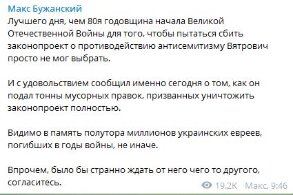 На предложение Вятровича отреагировал "слуга народа" Максим Бужанский - его идеологический оппонент и один из авторов законопроекта об антисемитизме.