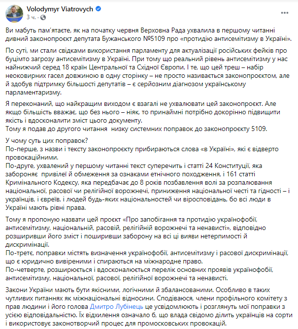 Также он предложил добавить в закон понятие "украинофобия" и отразить это в названии перед антисемитизмом. То есть в интерпретации Вятровича закон звучал бы так "О предотвращении и противодействии украинофобии, антисемитизма, национальной, расовой, религиозной вражды и ненависти"".