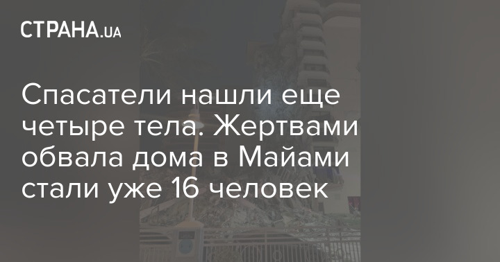 Власти муниципалитета Сарфсайд в американском штате Флорида сообщили, что спасатели нашли еще четыре тела жертв частичного обрушения 12-этажного жилого дома, которое произошло 24 июня.