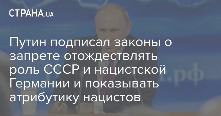 Президент РФ Владимир Путин подписал закон о запрете публично отождествлять цели и действия СССР и нацистской Германии во Второй мировой войне, а также отрицать решающую роль советского народа в победе над фашизмом.