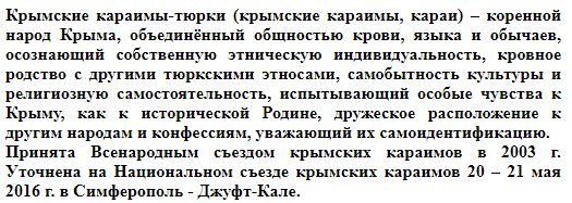 У крымских караимов есть официальный сайт karai.crimea.ru на российской платформе. Здесь можно найти следующие слова о самоидентификации народа.