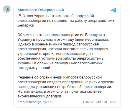 "Объемы поставок электроэнергии из Беларуси в Украину в прошлом и этом году были небольшими. Однако в осенне-зимний период белорусская электроэнергия, которая поставлялась по запросу украинской стороны, использовалась для обеспечения устойчивой работы энергосистемы Украины в сложные периоды неблагоприятных погодных условий", - говорится в сообщении пресс-службы ведомства.