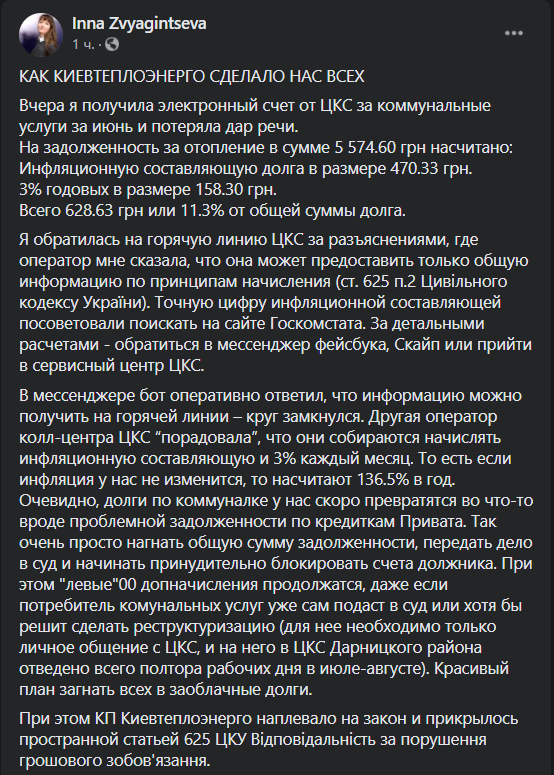 "Вчера я получила электронный счет от ЦКС за коммунальные услуги за июнь и потеряла дар речи. На задолженность за отопление в сумме 5 574.60 грн насчитано: