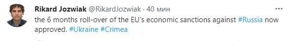 "Утверждено продление экономических санкций ЕС против России на 6 месяцев по Украине и Крыму", - отметил он.