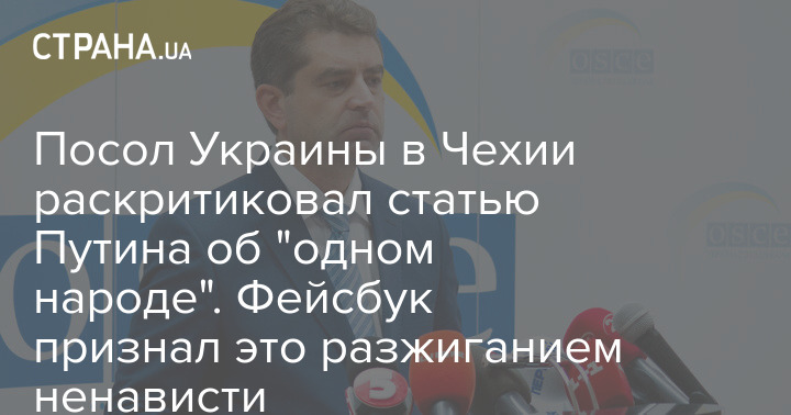 Администраторы социальной сети Facebook признали "разжигающим ненависть" пост посла Украины в Чехии Евгения Перебийноса, в котором он критиковал заявление президента России Владимира Путина о том, что украинцы и россияне это "один народ".