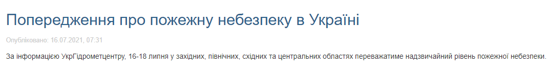 По данным Государственной службы Украины по чрезвычайным ситуациям, с 16 по 18 июля в западных, северных, восточных и центральных областях будет преобладать чрезвычайный уровень пожарной опасности.