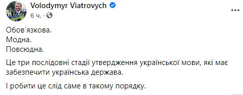 "Обязательная. Модная. Повсеместная. Это три последовательных стадии утверждения украинского языка, которые должно обеспечить украинское государство",  - написал депутат "Евросолидарности" Владимир Вятрович.