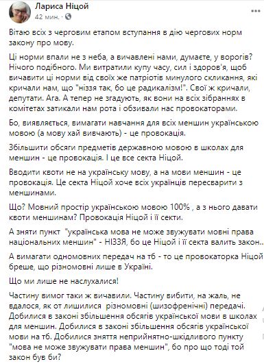 А снять пункт "украинский язык не может сужать языковые права национальных меньшинств" - низзя, потому что это Ницой и ее секта валит закон ... А требовать одноязычных передач на тв - это провокаторша Ницой врет, что разноязычные только в Украине. Что мы только ни наслушались!