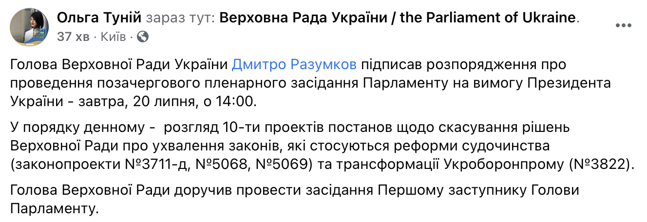 "В повестке дня - рассмотрение 10-ти проектов постановлений об отмене решений Верховной Рады о принятии законов, касающихся реформы судопроизводства (законопроекты №3711-р, №5068, №5069) и трансформации Укроборонпрома (№3822)", - написала Туний.