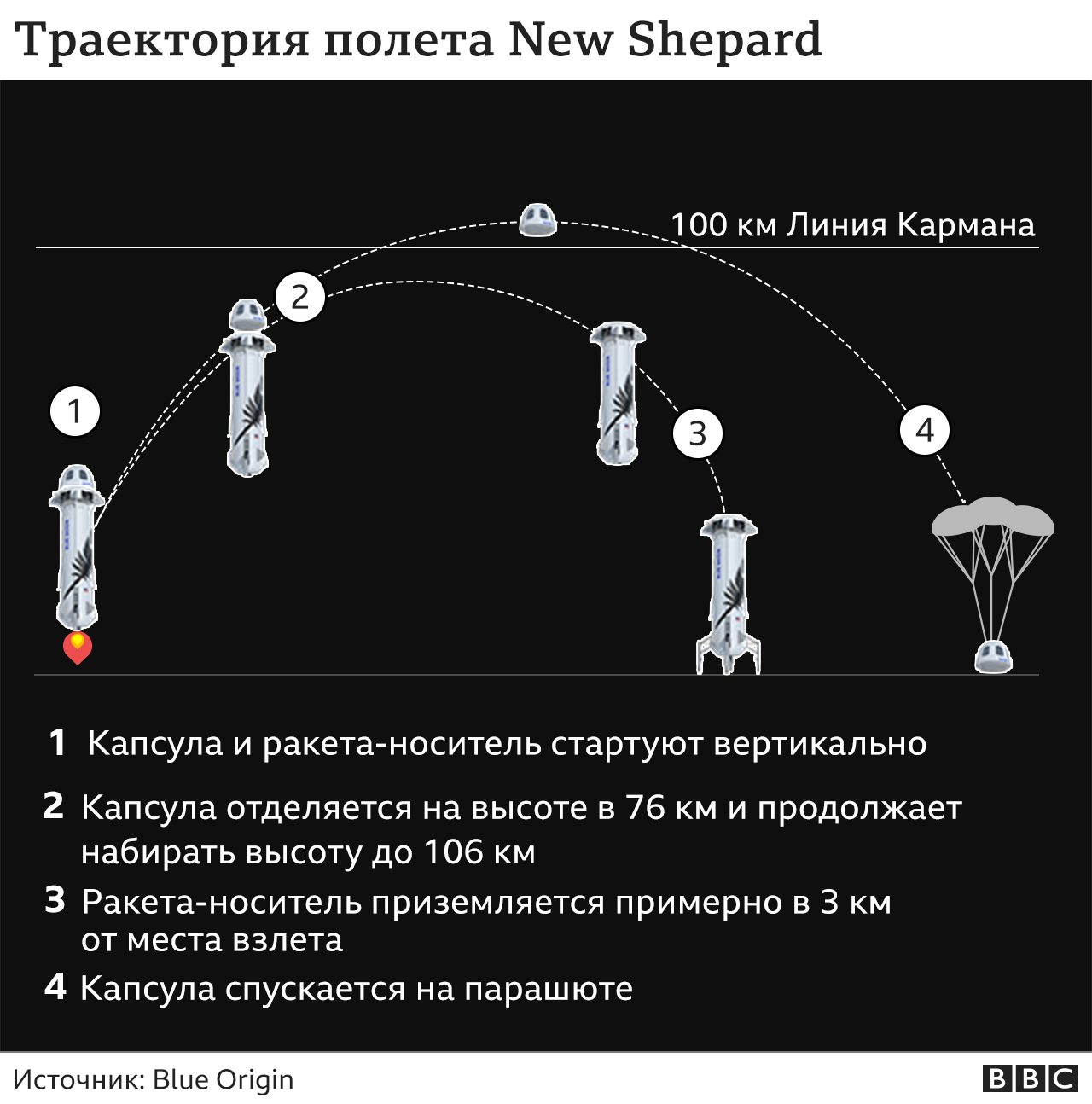 Траектория полета. Схематически маршрут полета космической капсулы с Безосом выглядел так. Как видим, он поднялся на шесть километров над линией Кармана, отделяющей Землю уже непосредственно от космического пространства.