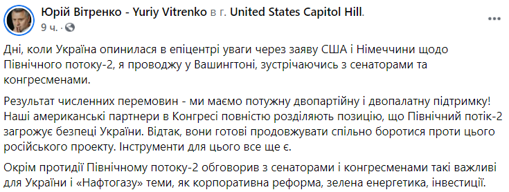 "Результат многочисленных переговоров - мы имеем мощную двухпартийную и двухпалатную поддержку! Наши американские партнеры в Конгрессе полностью разделяют позицию, что Северный поток-2 угрожает безопасности Украины. Следовательно, они готовы продолжать совместно бороться против этого российского проекта. Инструменты для этого все еще есть", - уверяет Витренко.