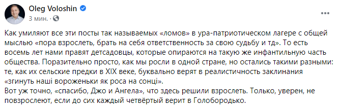 "Как умиляют все эти посты так называемых "ломов" в ура-патриотическом лагере с общей мыслью "пора взрослеть, брать на себя ответственность за свою судьбу и тд".
