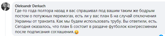 "Где-то года полтора назад я вас спрашивал под вашим таким же бодрым постом о потужных перемогах, есть ли у вас план Б на случай отключения Украины от транзита. Как мы будем использовать трубу. Вы ответили, есть. Сегодня оказалось, что план Б состоит в раздаче футболок конгрессменам после подписания соглашения", - иронизирует бизнесмен Александр Деркач.