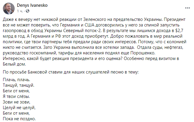 "Даже к вечеру нет никакой реакции от Зеленского на предательство Украины. Президент все не может поверить, что Германия и США договорились у него за спиной запустить газопровод в обход Украины Северный поток-2.