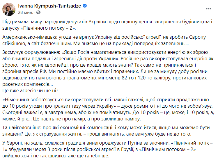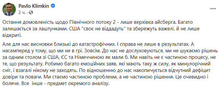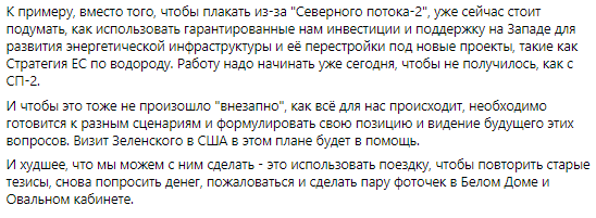 "Договоренности по "Северному потоку - 2" - это предательство, мы можем называть вещи своими именами. И осадок тем более горький, что в последнее время звучали пафосные заявления о поддержке украинских интересов и ценностей. Миллиард на Зеленый Фонд - спасибо, но, честно говоря, компенсатор слабоват".