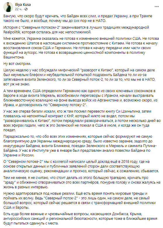 Международник Илья Куса пишет, что Украина неправильно поняла политику Байдена, который движется к союзу с Германией.