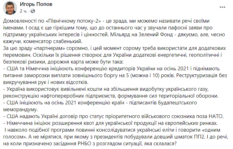 Экс-нардеп Игорь Попов называет договоренности США и Германии "зрадой".