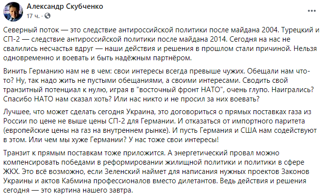 "Северный поток — это следствие антироссийской политики после майдана 2004. Турецкий и СП-2 — следствие антироссийской политики после майдана 2014. Сегодня на нас не свалились несчастья вдруг — наши действия и решения в прошлом стали причиной. Нельзя одновременно и воевать и быть надёжным партнёром.
