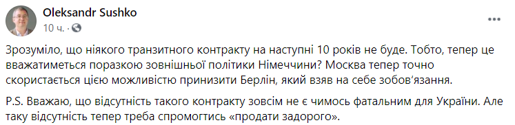 "Понятно, что никакого транзитного контракта на следующие 10 лет не будет. То есть теперь это будет считаться поражением внешней политики Германии? Москва теперь точно воспользуется этой возможностью унизить Берлин, который взял на себя обязательства".
