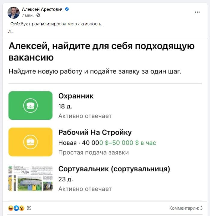 Среди предложений, которые социальная сеть считает "подходящими" для Арестовича перечислены: