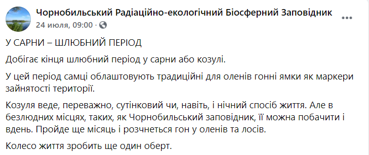 Также там добавили, что косуля ведет преимущественно сумеречный или даже ночной образ жизни. Но в безлюдных местах, таких, как Чернобыльский заповедник, ее можно увидеть и днем.