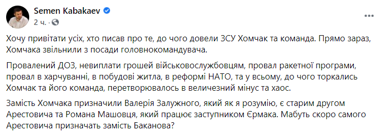 "Вместо Хомчака назначили Валерия Залужного, который как я понимаю, является старым другом Арестовича и Романа Машовца, который работает заместителем Ермака", - написал Кабакаев.
