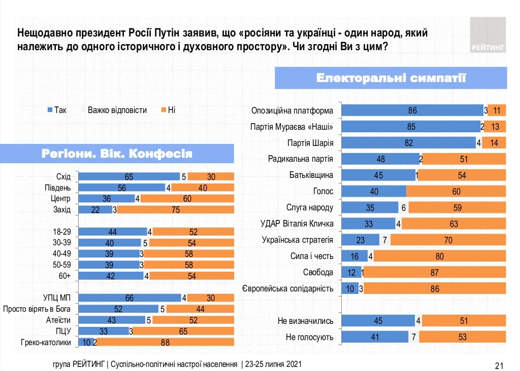 Социологическая компания "Рейтинг" опубликовала опрос, который уже стал сенсацией. Главным образом потому, что украинцев спросили, согласны ли они с тезисом Владимира Путина о том, что русские и украинцы – один народ.