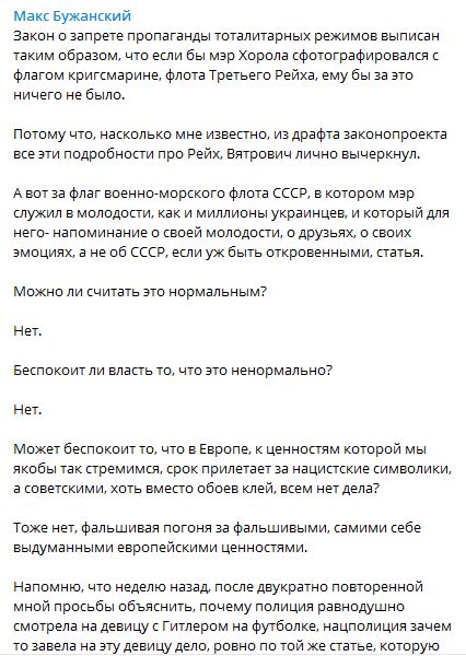 "Насколько мне известно, из драфта законопроекта все эти подробности про Рейх Вятрович лично вычеркнул. А вот за флаг военно-морского флота СССР, в котором мэр служил в молодости, как и миллионы украинцев, и который для него - напоминание о своей молодости, о друзьях, о своих эмоциях, а не об СССР, если уж быть откровенными, статья.