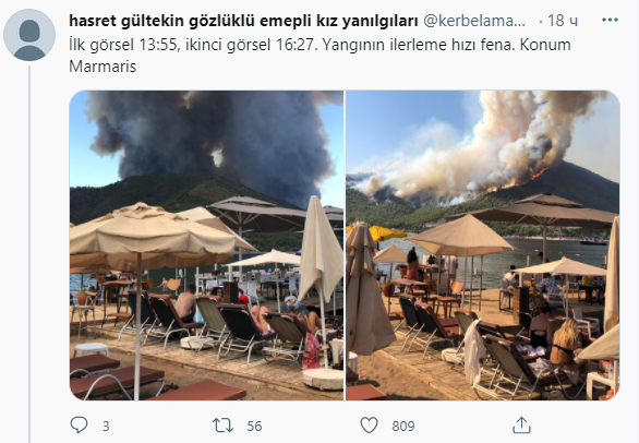 "Первое изображение сделано в 13:55, второе - в 16:27. Темпы распространения огня ужасны. Расположение Мармарис", - публикует местный житель.