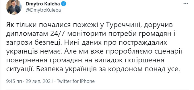 В МИД Украины сообщили, что среди пострадавших в лесных пожарах украинцев нет, но в ведомстве разрабатывают сценарии возвращения граждан Украины домой на случай ухудшения ситуации. Сейчас для украинцев в случае угрозы жизни и здоровью действует горячая линия консульства в Антальи: +90 554 169 96 60 и посольства Украины в Турции +90 539 550 98 98; +90 312 442 15 93.