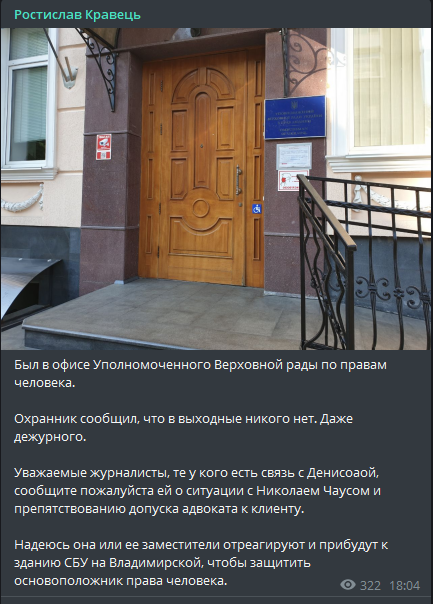 Адвокат экс-судьи Николая Чауса Ростислав Кравец сообщил о том, что был в офисе Уполномоченного Верховной рады по правам человека. В связи с этим он попросил журналистов сообщить омбудсмену Людмиле Денисовой о ситуации с Чаусом. В частности о том, что к нему не допускают адвоката.
