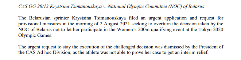 Представительница олимпийской сборной Беларуси легкоатлетка Кристина Тимановская, которая заявила, что ее хотели насильно вывести из Токио в Минск, обратилась в Спортивный арбитражный суд (CAS) с просьбой допустить ее к стартам на 200 метров. Однако ходатайство спортсменки отклонили.