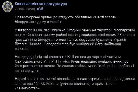 Пресс-служба Киевской городской прокуратуры сообщила, что расследование по факту гибели главы Белорусского Дома в Украине Виталия Шишова расследуется по ст.115 (умышленное убийство) с пометкой "самоубийство". Но вскоре после публикации пресс-служба отредактировала пост, убрав из квалификации пометку "самоубийство".