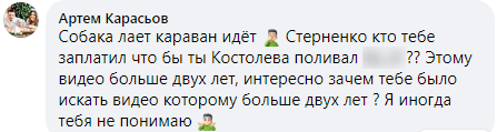 "Собака лает караван идёт. Стерненко, кто тебе заплатил, чтобы ты Костылева поливал Х... ?? Этому видео больше двух лет, интересно зачем тебе было искать видео которому больше двух лет? Я иногда тебя не понимаю", - написал Артем Карасев.