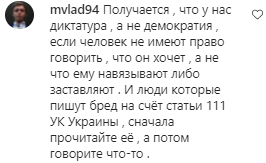 "Получается, что у нас диктатура, а не демократия, если человек не имеет права говорить, что он хочет, а не что ему навязывают либо заставляют. И люди, которые пишут бред на счет статьи 111 УК Украины, сначала прочитайте ее, а потом говорите что-то", - написал в комментариях пользователь с ником mvlad94.