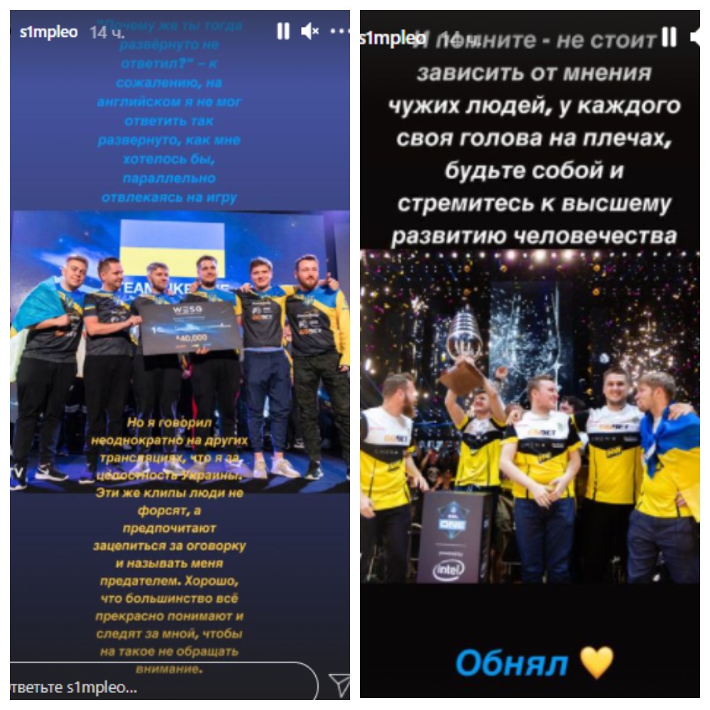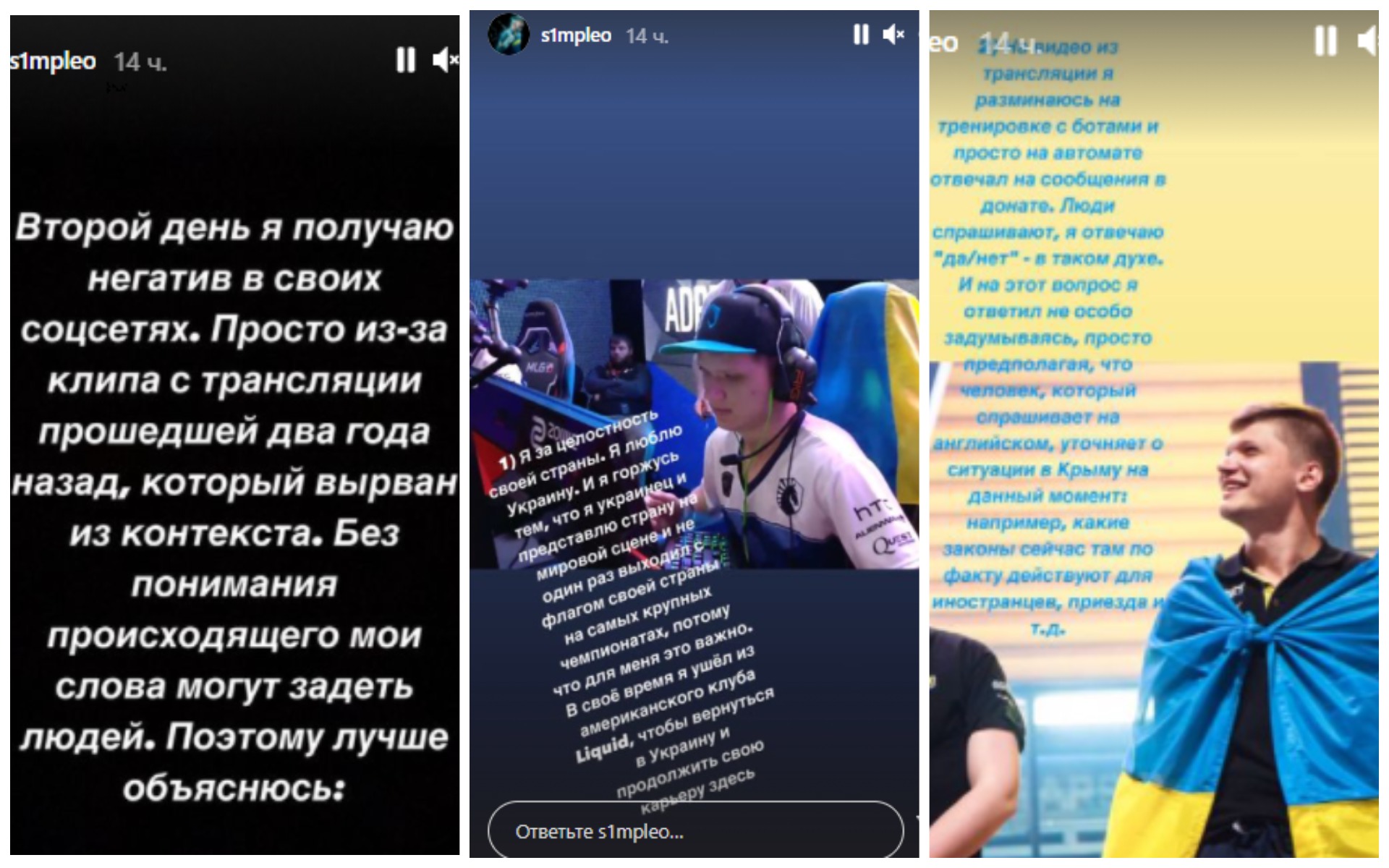 "Я за целостность своей страны. Я люблю Украину. И горжусь тем, что я украинец и представляю страну на мировой сцене, и не один раз выходил с флагом своей страны на самых крупных чемпионатах, потому что для меня это важно. В своё время я ушел из американского клуба Liquid, чтобы вернуться в Украину и продолжить свою карьеру здесь. На видео из трансляции я разминаюсь на тренировке с ботами и просто на автомате отвечал на сообщения в донате. Люди спрашивают, я отвечаю "да/нет" - в таком духе. И на этот вопрос я ответил не особо задумываясь, просто предполагая, что человек, который спрашивает на английском, уточняет о ситуации в Крыму на данный момент: например, какие законы сейчас там по факту действуют для иностранцев, приезда и т.д.".