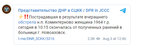 "Пострадавшая в результате вчерашнего обстрела н.п. Коминтерново женщина 1964 г.р. сегодня в 10:15 скончалась от полученных ранений в больнице г. Новоазовск", - говорится в сообщении.