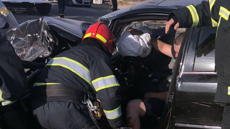 Полицейского пришлось доставать из салона авто с помощью спасателей. Фото: ГСЧС