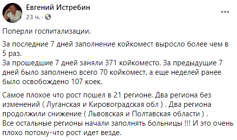 В отдельных регионах уже пошел тревожный рост госпитализаций. Уже в пяти областях она не соответствует показателям "зеленой" зоны карантина (должно быть менее 50%).