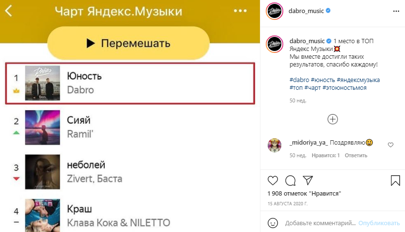 Но если сравнивать современных русскоязычных исполнителей, то Моргенштерн больше популярен именно в Интернете (поскольку его тексты не проходят телерадио-цензуры), тогда как песни "Дабро" полюбились многим через радиостанции и так называемое "сарафанное радио". Треки мгновенно перекочевали в такси, на курорты, во дворы. Так песня "Юность" стала всенародно известной год назад и полюбилась нескольким поколениям одновременно.