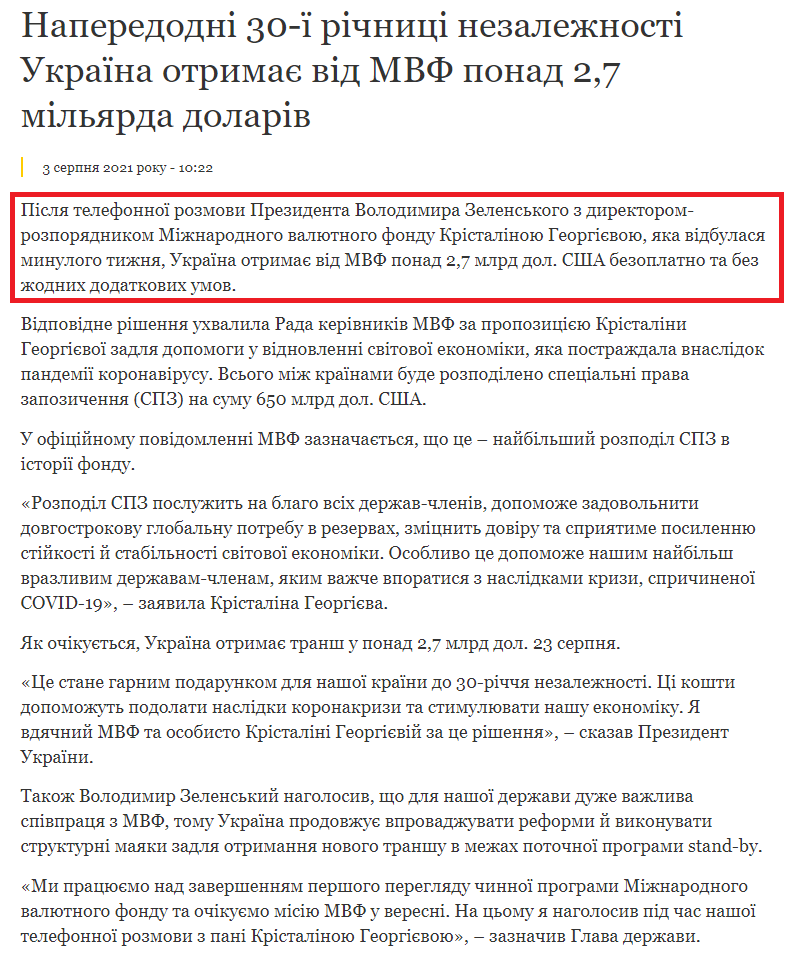 Из начала сообщения можно сделать вывод, что это решение было принято благодаря разговору Зеленского с директором-распорядителем МВФ Кристалиной Георгиевой.