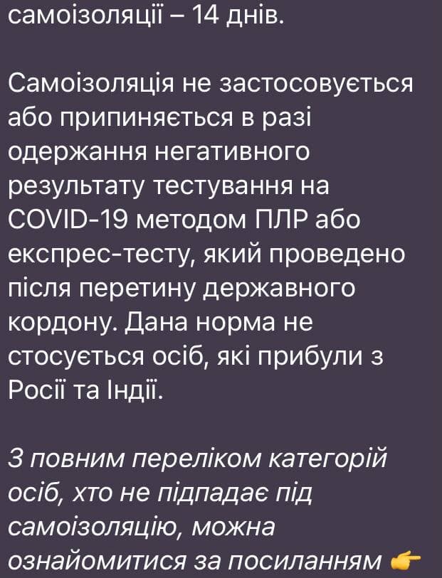 Для приехавших из-за других стран, кроме РФ и Индии, украинцев и иностранных граждан, обязательно самоизоляция на десять дней (начинается она через 72 часа после пересечения границы, контролируется мобильным приложением "Вдома").