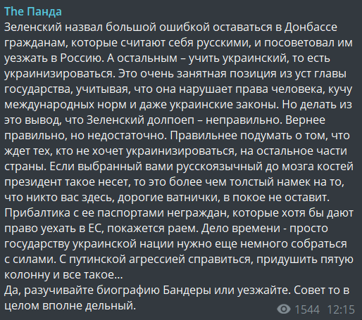 "Зеленский назвал большой ошибкой оставаться в Донбассе гражданам, которые считают себя русскими, и посоветовал им уезжать в Россию. А остальным – учить украинский, то есть украинизироваться. Это очень занятная позиция из уст главы государства, учитывая, что она нарушает права человека, кучу международных норм и даже украинские законы. Но делать из этого вывод, что Зеленский до...еб – неправильно. Вернее, правильно, но недостаточно. Правильнее подумать о том, что ждет тех, кто не хочет украинизироваться, на остальной части страны. Если выбранный вами русскоязычный до мозга костей президент такое несет, то это более чем толстый намек на то, что никто вас здесь, дорогие ватнички, в покое не оставит. Прибалтика с ее паспортами неграждан, которые хотя бы дают право уехать в ЕС, покажется раем. Дело времени – просто государству украинской нации нужно еще немного собраться с силами. С путинской агрессией справиться, придушить пятую колонну и все такое…
