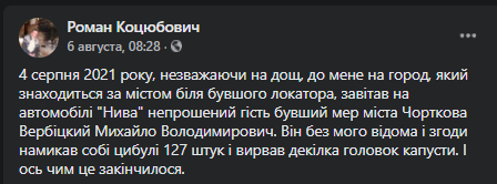 К нему на дачу, несмотря на плохую погоду, ворвался "непрошенный гость, бывший мэр города Чорткова Вербицкий Михаил Владимирович".