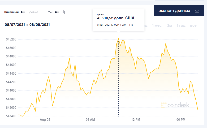 Согласно показателям биржи Coindesk, утром 8 августа стоимость криптовалюты достигала 45210 долларов США.