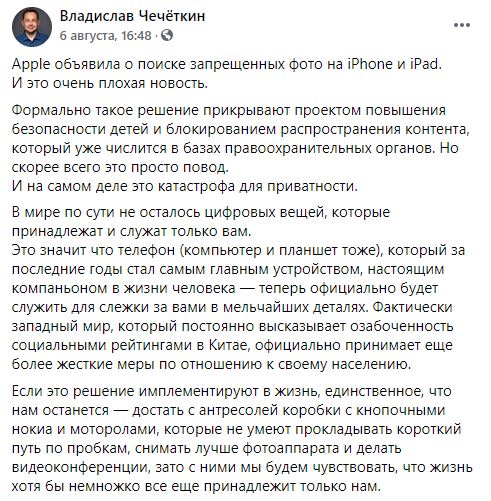 "Apple объявила о поиске запрещенных фото на iPhone и iPad. И это очень плохая новость. Формально такое решение прикрывают проектом повышения безопасности детей и блокированием распространения контента, который уже числится в базах правоохранительных органов. Но скорее всего это просто повод. И на самом деле это катастрофа для приватности.